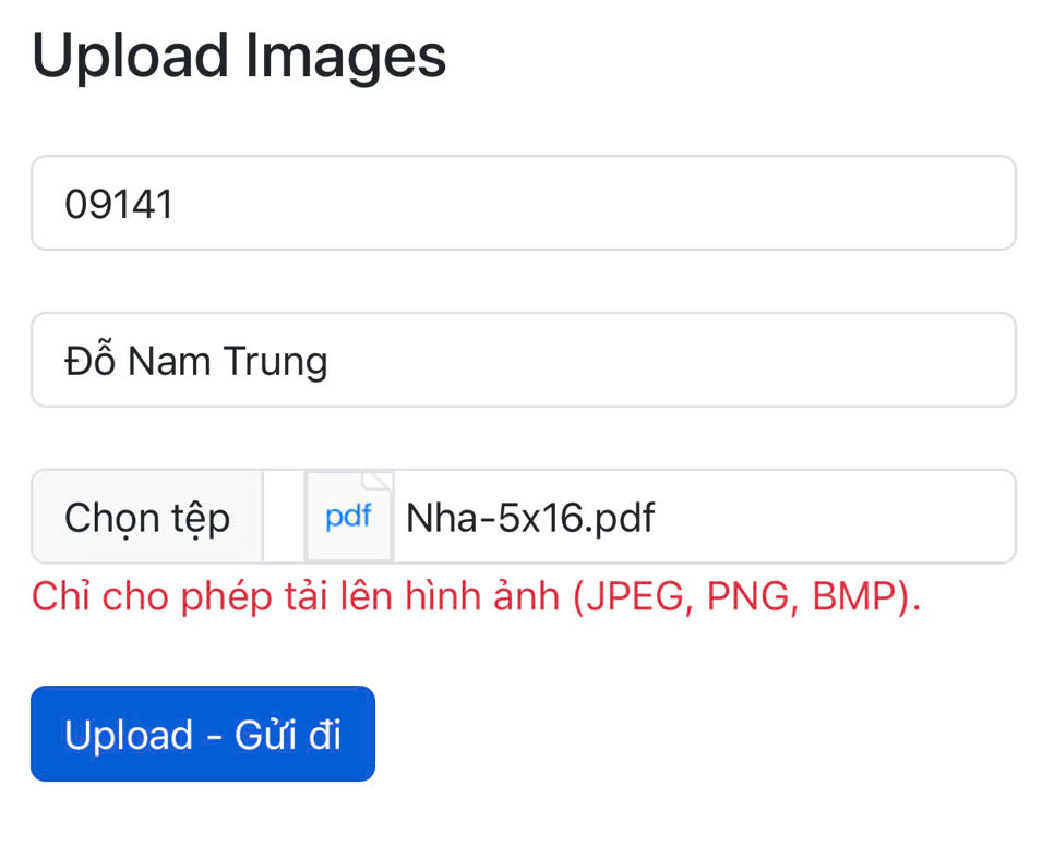 – Chức năng chỉ cho phép gửi đúng file hình ảnh (định dạng có đuôi .jpg, .png, .bmp, ..) các định dạng khác như file pdf, excel, zip, rar, sẽ không được cho phép.